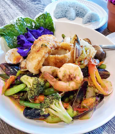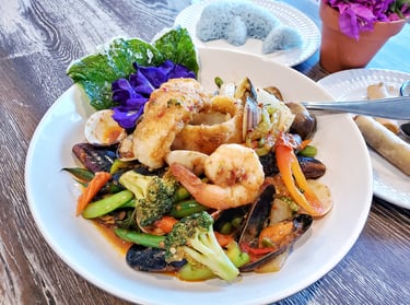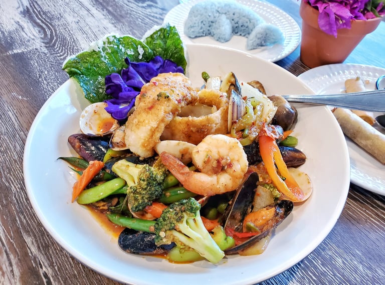 Fresh shrimps, white clams, mussels, scallop, fish, carrot, zucchini, broccoli, cauliflower, bell pepper, green bean and fresh basil leaf and galangal with fresh chilis basil sauce.