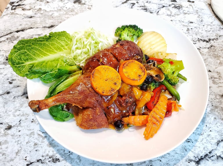 Half crispy duck served with carrot, zucchini, broccoli, cauliflower, bell pepper, green bean and fresh basil leaf.